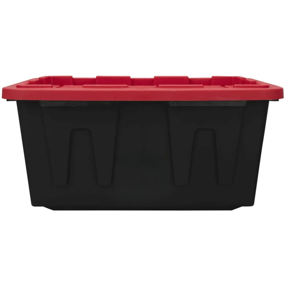 Organize clutter and hide unused items with the Hyper Tough 27 gallon snap-lid plastic storage tote, one of the most popular sized totes for home storage. Made of durable recycled plastic, the black storage tote allows you to hide away things you do not want to be seen, while the red patterned snap-lid adds a of color to your space. The 2-point snap-lid ensures your items are safely secure during storage or transport. The specially molded lid allows you to stack multiple totes on top of each other to prevent toppling and sliding while maximize vertical storage space. This easy to grip handles makes it easy to carry and move from room to room.
