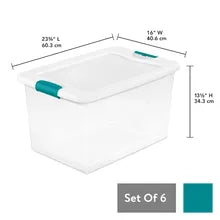 Need help getting organized? Step up to the Sterilite 64 Quart Latching Box, featuring a modern space saving shape and an innovative hinging lid. Simply undo one latch and lift the lid for easy access, all with one hand. The other latch stays attached and acts as a hinge, even when the lid is opened all of the way. This size Latching Box is ideal for storing off season clothing, sporting equipment, boots, blankets and other bulky items around the home. The recessed lids allow same size storage boxes to stack neatly on top of each other to use vertical storage space efficiently. The 32 Qt and 64 Qt Latching Boxes use the same lid, allowing both the shallow and deep sizes to be stacked in same footprint. The overall assembled dimensions of this item are 23 3/4" L x 16" W x 13 1/2" H.