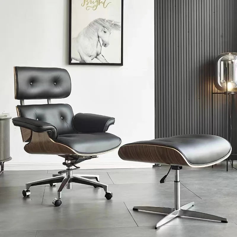 The Mid-Century Lounge Chair and Ottoman Replica are softened by ultra-plush padding and indulge in genuine leather upholstery.