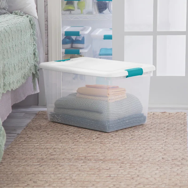Need help getting organized? Step up to the Sterilite 64 Quart Latching Box, featuring a modern space saving shape and an innovative hinging lid. Simply undo one latch and lift the lid for easy access, all with one hand. The other latch stays attached and acts as a hinge, even when the lid is opened all of the way. This size Latching Box is ideal for storing off season clothing, sporting equipment, boots, blankets and other bulky items around the home. The recessed lids allow same size storage boxes to stack neatly on top of each other to use vertical storage space efficiently. The 32 Qt and 64 Qt Latching Boxes use the same lid, allowing both the shallow and deep sizes to be stacked in same footprint. The overall assembled dimensions of this item are 23 3/4" L x 16" W x 13 1/2" H.